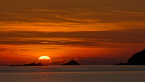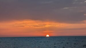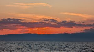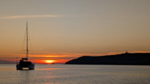 Endlich ein Sprung ins Wasser bei angenehmen Temperaturen. Bei der Erkundungsfahrt mit dem Beiboot verfolgte uns kurzfristig ein kleiner Rochen in der Heckwelle, Natur pur. Auch ohne Schnorchel sahen wir überall bis auf den Grund. Als Draufgabe hatten wir noch einen prächtigen Sonnenuntergang und parallel dazu ein schmackhaftes Buchtmenü.