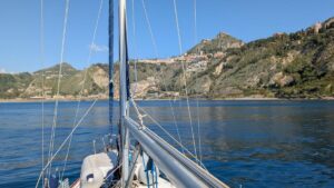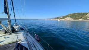 Mein Ziel war die südliche Bucht von Taormina, die ich gegen 09.00 Uhr erreichte. Es gab dort genug Platz zum Ankern (nur ein anderer Segler) und der Schwell war aushaltbar. Nach 265 NM und insgesamt 50 Stunden konnte ich einen sonnigen Tag genießen und ausruhen.
