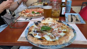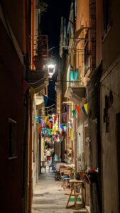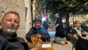Nach einem ersten Rundgang mussten wir jedoch noch unseren Proviant auffüllen und begaben uns zum nahen CONAD-Markt, welcher erstaunlich gut sortiert und auch nicht überteuert war. Das Abendessen nahmen wir nachher beim Giro Tonno ein. Dort kauft man ein Ticket und bekommt dann bei einem Stand, je nach Ticket, verschiedene Portionen gereicht die daneben auf einfachen Holzbänken/Tischen verspeist werden. Es gab Couscous, ein ortstypisches Nudelgericht und ein Thunfischragout. Dies scheint eine der Hauptattraktionen zu sein, denn der Andrang war ziemlich groß. Gut gesättigt gings dann weiter ins Getümmel. Bis 22.30h war überall der Bär los. Plötzlich verließen der Großteil aller Besucher die Lokale, um diese Zeit begann nämlich ein Popkonzert bei einer der Bühnen. Wir googelten „The Kolores“ und erfuhren, dass diese Band soeben einen der Haupthits in Italien spielte. Also nichts wie hin, aber nicht bis vor die Bühne, denn die Lautstärke reichte auch bei 150m Entfernung. Es dauerte allerdings über ½ Stunde bis der Haupthit „Italo Disco“ über die Besuchermenge schallte. Arme Andrea, sieh hört lieber „Ostbahn Kurti“ und empfand diese Musik als Qual. Martina und ich sahen das etwas anders 😉 Danach gings aber ab in die Kojen, war eh schon Mitternacht.