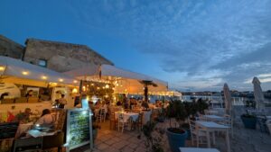 Ich benötigte ein paar Versuche bis das Eisen hielt, in der Nähe des Ufers gibt es anscheinend nur Sand auf Felsplatten. Etwas weiter gegen Buchtmitte war es sofort besser und alles passte. Später gings mit dem Dingi in den kleinen Hafen von Birzebouga. Ein Ort mit keinen Besonderheiten, wo wir ein Chinesisches Restaurant fürs Abendessen wählten. Die Preise waren hier locker um ein Drittel niedriger. Bei Einbruch der Dunkelheit befanden wir uns wieder auf der Calisto.