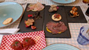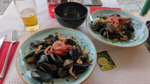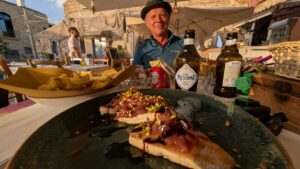 Die „GIRO TONNO“ Veranstaltung ging ihrem Ende zu und am Abend hatten die meisten Stände bereits Verkaufsschluss. Wir vergönnten uns diesmal in einer guten Trattoria ein italienisches Abendessen, mit typ. Vorspeisen, einem Thunfischsteak und Hauswein. Ein köstliches Vergnügen, welches aber auch bezahlt wird, denn Carloforte gehört eher nicht zu den billigen Ecken.