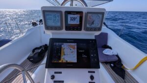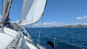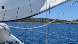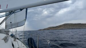 Ich hatte die letzten Tage natürlich immer die Wettervorhersage (den Wind) beobachtet und es tat sich genau ein halbwegs ideales Fenster für die kommenden drei Tage auf. Danach wäre es auf längere Zeit sehr unbeständig (mit häufigem Gegenwind) geworden. Mein Entschluss war daher die gesamte Strecke bis Südsardinien nonstop in etwa 2 ½ Tagen solo durchzusegeln. Nach ein paar Stunden waren die letzten Konturen von Gozo verschwunden und es gab nur mehr Wasser rundherum. Bis zum Abend des ersten Tages lief es ganz gut, sobald es dämmerig wurde, frischte der achterliche Wind auf und es wurde wegen der stärkeren Dünung etwas schwierig die Segel ordentlich in Position zu halten. Zusätzlich hatte ich das Gefühl in einer Gegenströmung zu sein. Trotz Wind mit 15Kn hatte ich keine richtige Geschwindigkeit. 3,5Kn Speed war mir zu wenig und ich nahm den Motor dazu. So fuhr ich in meine erste Nacht. Die Wellen wurden höher und der Wind steigerte sich in Böen etwas. Es kamen echt ungemütliche Stunden. Ich hielt mich die meiste Zeit in der Kajüte auf und beobachtete alles von meinem Tablett, wo ich in gewohnter Weise die Oberfläche des Plotters spiegelte. Radar und AIS war eingeschaltet, mein Garmin Inreach aktiviert, ein Gefühl der Sicherheit, welches ich nicht missen möchte. In dieser Nacht gab es jedoch wegen der höheren achterlichen (von hinten) Wellen immer wieder Radar Fehlalarme, da dieses auch die brechenden Wellen als Radarziel identifizierte. Drinnen schepperte alles und manchmal rumpste es, wenn wieder mal irgendetwas in einem Kastl gegen die Wand stieß. Ich verkeilte mich auf der Salonbank zwischen Tisch und Rückenlehne, fand jedoch sehr wenig Schlaf. In der Morgendämmerung schaute ich wieder mal raus und setzte den Vorsegelausbaumer zur Stabilisierung der Genua. Im Finstern war mir das zu mühsam, jetzt passte es und der Speed war gleich viel besser.