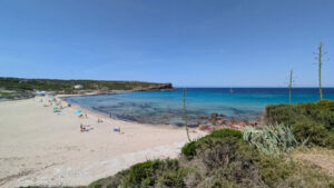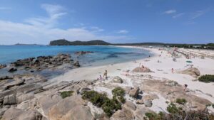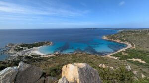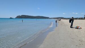 Nächsten Tag erkundete ich den Nahbereich zu Fuß. Auf der östlichen Seite dieser kleinen Halbinsel lag in etwa 1km Entfernung ein malerischer Sandstrand mit den typischen abgerundeten Felsen und azurblauem Wasser. Genauso wie man sich Sardinien vorstellt. Es gab erst vereinzelte Badegäste und in der Bucht lagen ein paar Segler vor Anker. Es hatte angenehme Temperaturen, vor allem dort wo es windgeschützt war. Eine wirklich schöne Gegend. Die Ortschaft Villasimius lag allerdings zwei Km entfernt, direkt im Marinabereich gabs keinen Supermarkt, nur zwei Lokale und ein paar Geschäfte.