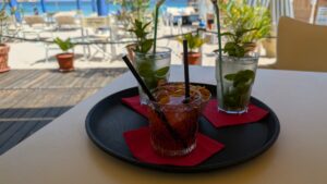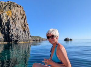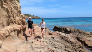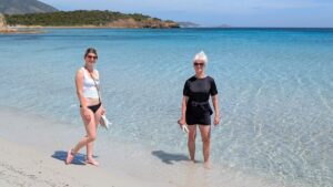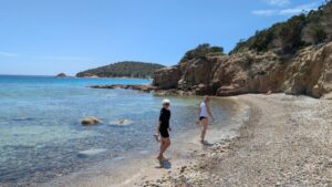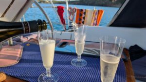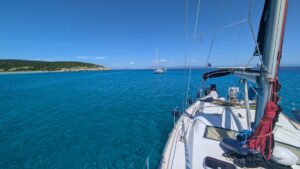 Es folgte ein traumhafter Tag mit einem leichten Segellüftchen Richtung Insel Antioco, zur Bucht Coaquaddus im Südosten dieser Insel. Ein perfekter Ankerplatz mit Sandgrund und viel Platz. Türkises Wasser, kaum Wind und angenehme Temperaturen. Wir fuhren mit dem Beiboot an Land und genossen diese Szenerie. Bis zum Abend lagen insgesamt nur fünf Segler vor Anker. Das Abendessen konnten wir diesmal an Deck genießen und weil es so schön war, gab es Prosecco dazu 😉