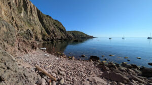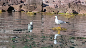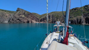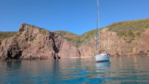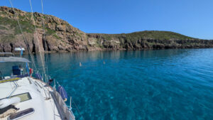 Leider gab es schon wieder eine Starkwindprognose, welche zwei Tage später ab Mittag beginnen sollte. Deshalb lösten wir bereits am nächsten Vormittag abermals die Leinen und begaben uns auf eine zweitägige gemütliche Inselrundfahrt (insgesamt etwa 20NM). Gegen den Uhrzeigersinn zuerst nach Norden und dort auf die Westseite von San Pietro. Eine schroffe Felsküste bei glatter See. Schön zum Schauen, aber vorerst keine Ankerplätze. Erst nördlich der Bucht La Caletta sahen wir vor der Steilküste plötzlich zwei Segelmasten in der Ferne und fuhren neugierig hin. Es entpuppte sich eine traumhafte Bucht mit Sandgrund vor einer gewaltigen Felskulisse. Glasklares Wasser mit 23 Grad, Möwengeträllere, kein Wind und genug Platz zum Ankern. Hier blieben wir und genossen einen herrlichen Übernachtungsplatz.