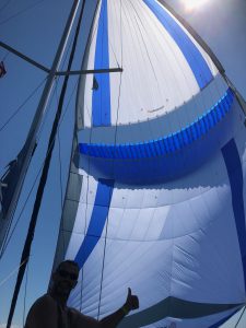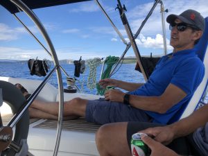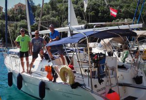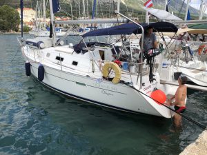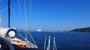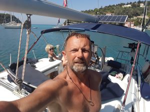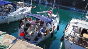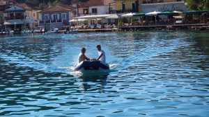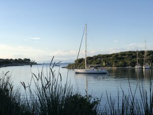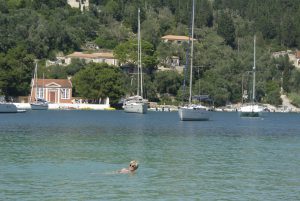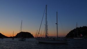 Weiter gings durch den Lefkaskanal und auf direktem Weg zur Insel Paxos. Zuerst etwas Gegenwind und –wellen, doch je näher wir Paxos kamen desto besser wurde es. Zwischendurch ein kleines Hoppala mit einer schwimmenden Boje. Normalerweise nimmt man an, dass daran etwas befestigt ist und die Leine senkrecht nach unten führt. Doch diesmal war dem nicht so, die paar Meter Abstand hatten nicht gereicht, denn es hing eine lose Leine daran welche 10 Meter quer lief. Der Aufschrei von Walter kam etwas zu spät, denn unmittelbar darauf hatte mein Ruder diesen Strick gefangen. Um das Procedere abzukürzen musste ein Messer her, Seil durchschneiden, Boje auf der einen Seite und das Restseil flutschte übers Ruder – fertig und Weiterfahrt. ….wieder was dazugelernt. Es zahlt sich doch aus den Autopilot kurzfristig auszuschalten und solche Bojen in Sicherheitsabstand zu umfahren.