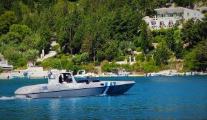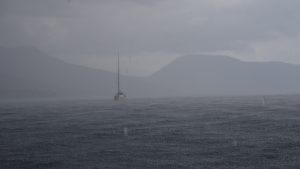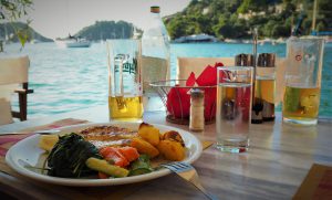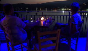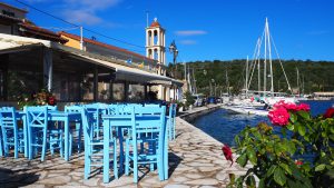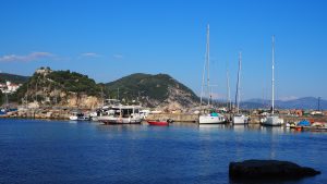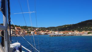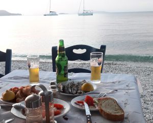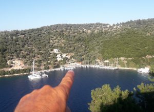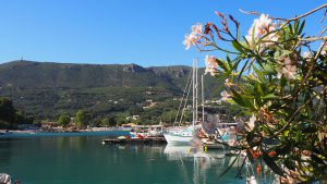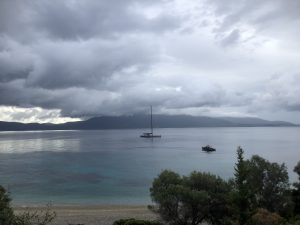 Die nächste Etappe führte uns wieder nach Norden, zwischen Kalamos und Mytikas durch und weiter rauf nach Paleiros. Permanent zogen tief liegende Wolken um uns herum, und knapp vor dem Ziel erwischte uns ein richtiger Schütter. Man sah kurzfristig keine 50 Meter, alles war in Regendunst gehüllt. Beim Anlegen hatte es bereits aufgehört – alles ok – ein toller Liegeplatz im Hafen, das sehr gute Gyros-Abendmenü und ein Abschlussbier im Strandcafe rundeten diesen Tag ab.