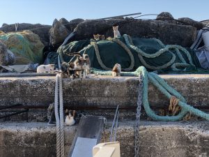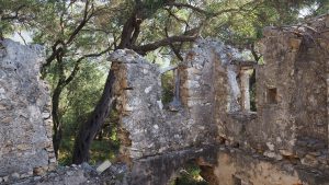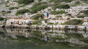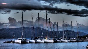 Nach einer Nacht in Meganisi/Karnagio fahren wir zwischen Kalamos und Meganisi Richtung Süden. Leider ist kaum Wind und ich kann den Parasailor nicht hissen. Dafür ziehen rund um uns Wolkenberge auf, welche eine unbeständige Wetterphase ankündigen. Am Südende von Kalamos biegen wir nach Osten ab und steuern in weiterer Folge den Hafen von Kastos an. Walter darf schwimmend die Landleinen ausbringen und kurze Zeit später liegen wir im Pulk mit einigen andern Seglern gut verheftet im Hafenbecken. Der Ankergrund ist zwar nicht besonders, doch der bereits mit 20 Knoten wehende Wind bläst genau in Längsrichtung auf unser Heck. Der Regen hielt sich zum Glück zurück, nur die Temperatur war noch nicht sommerlich. In den Restaurants wurden die durchsichtigen Windschutzplanen herabgelassen, Regenjacke und Pullover waren griffbereit.