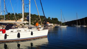 In der Mongonissi Bay hatten wir einen Tag reichlich Wind. Genau in dem Moment, wo er von der Seite mit 20-25 Knoten andrückte hat mir ein netter Seglerkollege meinen Buganker rausgerissen (wir lagen r.k., mit ca. 45m Kette) und ist mit diesem noch nach backbord gedriftet. Meine Ankerkette lag letztendlich ca. 45 Grad querab, über mehrere Leinen anderer Boote und schon ziemlich nahe des kleinen seichten Strandes…. zum aus der Haut fahren!! Die Calisto war bereits eingedampft, und als dieser Idiot die Ankerketten entwirrt hatte, musste ich wohl oder übel wieder raus fahren und bei noch immer starkem Seitenwind abermals anlegen. Zum Glück hatte ich aktive Liegeplatznachbarn, die mir mit den Leinen behilflich waren.
