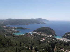 Andrea war erstmals in Korfu und auch ich kannte die Insel außerhalb der Stadt kaum. Es musste ein Mietauto her, und mit diesem fuhren wir an die Westküste nach Paleokastritsa. Ein kurzer Badestopp mit Kaffee, etwas Sightseeing im Hafen und weiter an die Nordküste. Mit Zwischenstopp hoch oberhalb der Küste und in Kassioppi. Traumhafte Ausblicke, kühlendes Baden, Kaffee und Zwischendurchsnack – ein netter Ausflug. Einziges Minus: In Kassioppi parkte ich ca. zwei Stunden nahe des Zentrums ganz knapp am Gartenzaun eines Privathauses. Als wir wieder zurück kamen, traute ich meinen Augen nicht – der Hausbesitzer hatte offensichtlich Selbstjustiz geübt und den Inhalt eines mittelgroßen Blumentopfes, also Erde und Pflanze, auf das Dach unseres Mietautos geleert… die Erde verteilte sich vom Dach über die Windschutzscheibe bis zu den Scheibenwischern unterhalb der Motorhaube…. Da nichts beschädigt war vermied ich großes Aufsehen und fuhr 500m weiter um die nächste Ecke und beseitigte dort diesen Übelstand. Vor lauter „angefressen sein“ hab ich aber auf das Fotografieren vergessen…